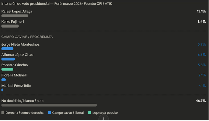 En paralelo, el voto de derecha se distribuye entre Rafael López Aliaga y Keiko Fujimori, ambos alrededor del 11–13%. La fragmentación abre un escenario en el que un candidato con menos del 10% podría acceder al balotaje.